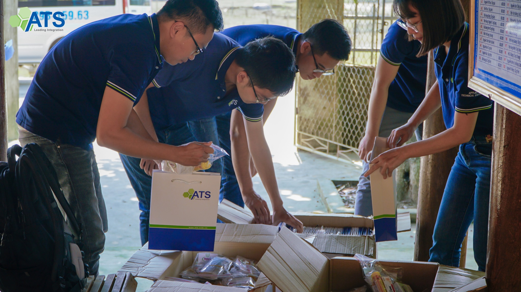 Đoàn tình nguyện ATS cẩn thận chuẩn bị từng gói quà bao gồm thuốc men và tiền mặt để hỗ trợ người dân Xóm Phú Lập vượt qua ảnh hưởng của bão lũ